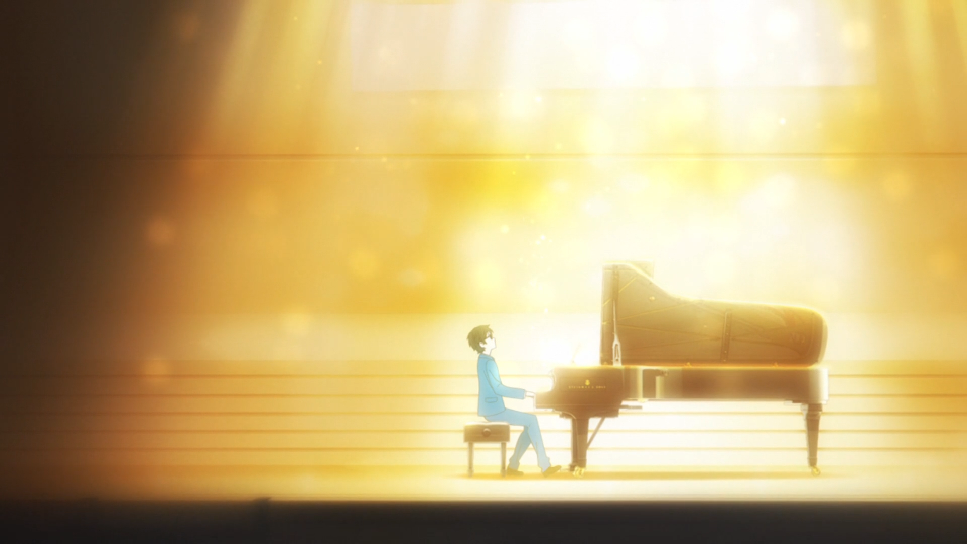 Even after all this, the anime concludes with one more idea to ingest: that this was and is a romance tale. However, it’s very unorthodox, perhaps even surprisingly unfulfilling…or is it? Truth be told, Kousei never says those three little words to Kaori nor does Kaori say them to Kousei’s face. But like all of the other musical performances throughout the anime, they didn’t have to. Because their music did the talking for them. Emi’s passionate pleas resounded from her piano; Aiza’s determination to defeat his long-standing rival echoed throughout the stadium; and Kousei’s farewell to the mother he’s always feared emanated in a way that only a son could play. Therefore it is only fitting that the final performance be not one filled with selfishness, anger, or goodbyes; it’s a duet from the heart of the couple that never got to be. That entire segment, combined with the final letter, ends the anime in a perfectly poignant way.