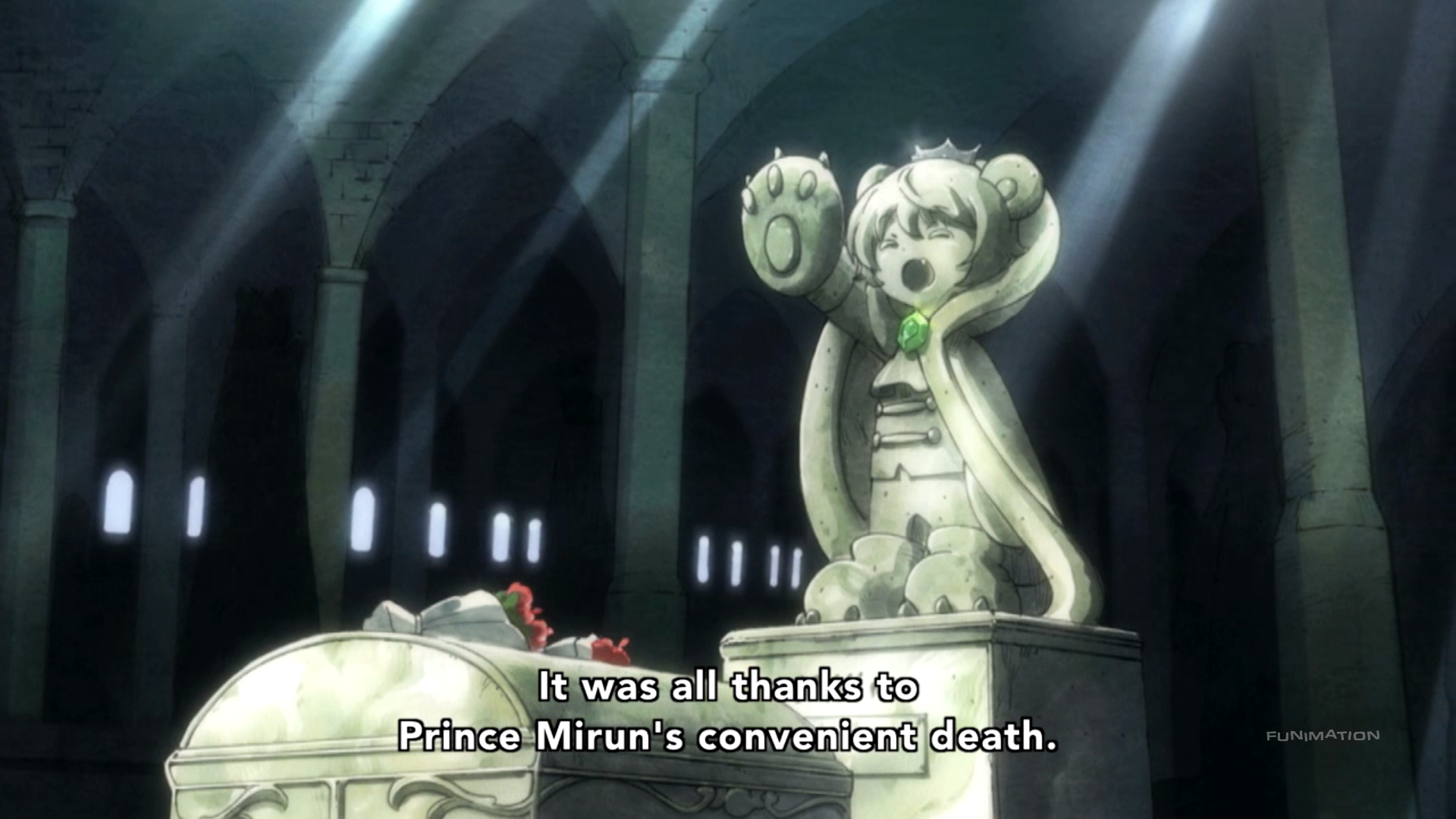 -Explanation: Mirun’s death comes somewhat as a surprise to the audience. After all of the Earthly trauma and all of the untold countless times he was sent away to die, he is done in by…a bee sting. The unseeing servant describes the event as an “accident,” but as we, she, and Lulu know, that isn’t the case.