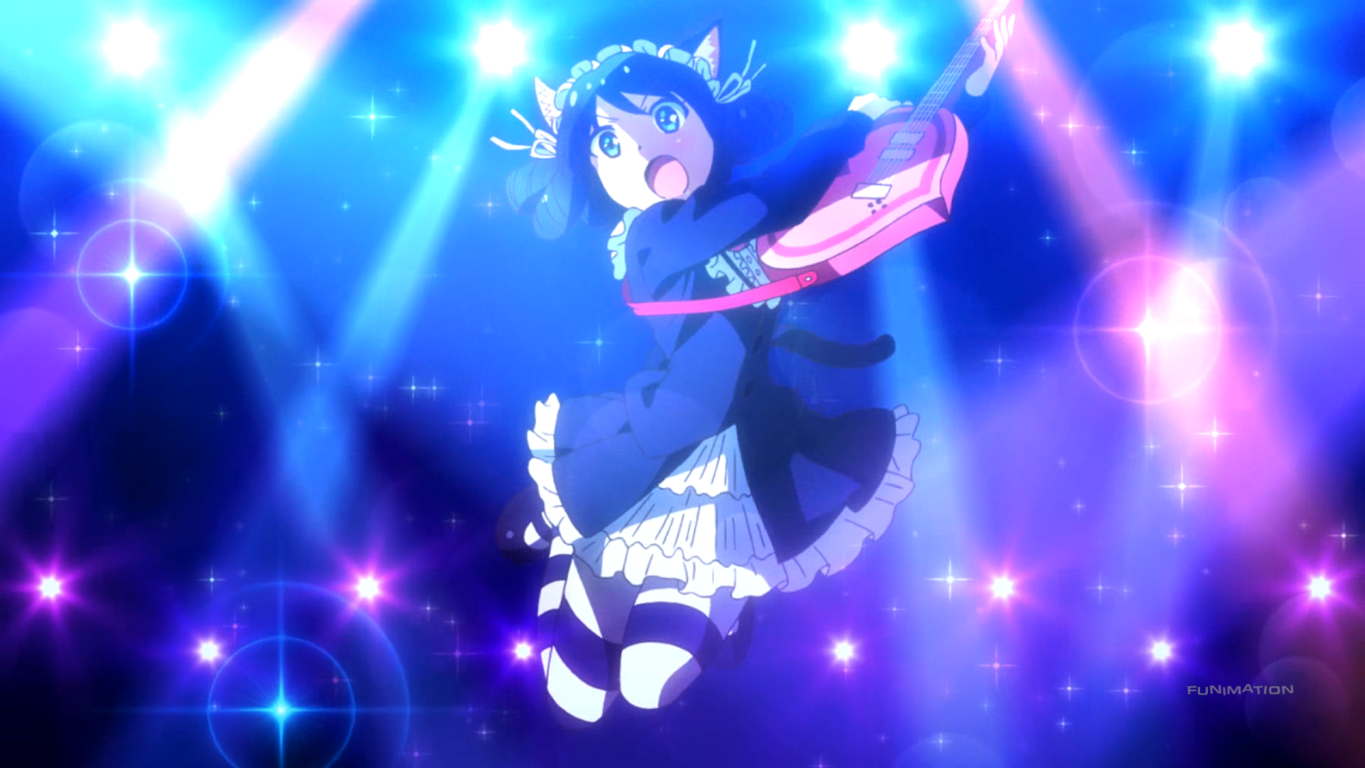 As for Cyan, her character is one of the worst that the show has to offer. It’s rather unclear what her character’s purpose is besides acting cute, fighting the bad guys, and being the fourth person of “Plasmagica.” The very beginning of the season painted her as someone with self-esteem issues, as a girl without the courage to do what she really wanted. For the rest of the season, the show then places its focus on the other girls, other bands, and even other characters that don’t directly influence Cyan and her development. She’s quite passive, being nice and saying kindhearted words to those around her on occasion, but never really standing out as a person let alone as the main character of the anime. In other words, she never seems affected by what happens, instead acting and speaking as she regularly does, going about her business the same way as always. It’s not until the conclusion that she finally decides to muster the courage to do what she could not, but without the proper build-up, it happens too suddenly and seemingly out of nowhere. It makes sense that her character would progress to this point, considering where she started, but nothing in the middle indicated that she was heading there.