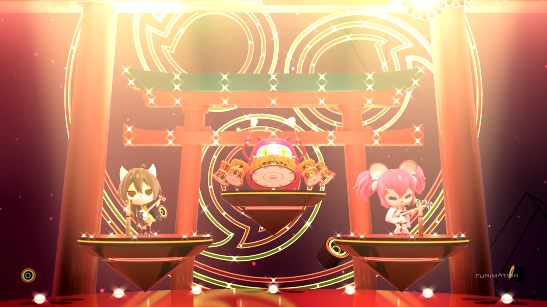 When the characters are not in three-dimensional mode, the designs maintain high quality. Each cast member is, more or less, an animal of some kind; Cyan is a cat, Chuchu is a bunny, etc. Their animal backgrounds provide them with small details – such as Moa’s fluffy hair (since she’s a sheep) and Rom’s spotted cloak (since he’s a cheetah) – but the show goes beyond such symbolism. They all have their own distinct colorings, accessories, instruments, and clothing that separate them not just from individual bands but from their own group members, too.
