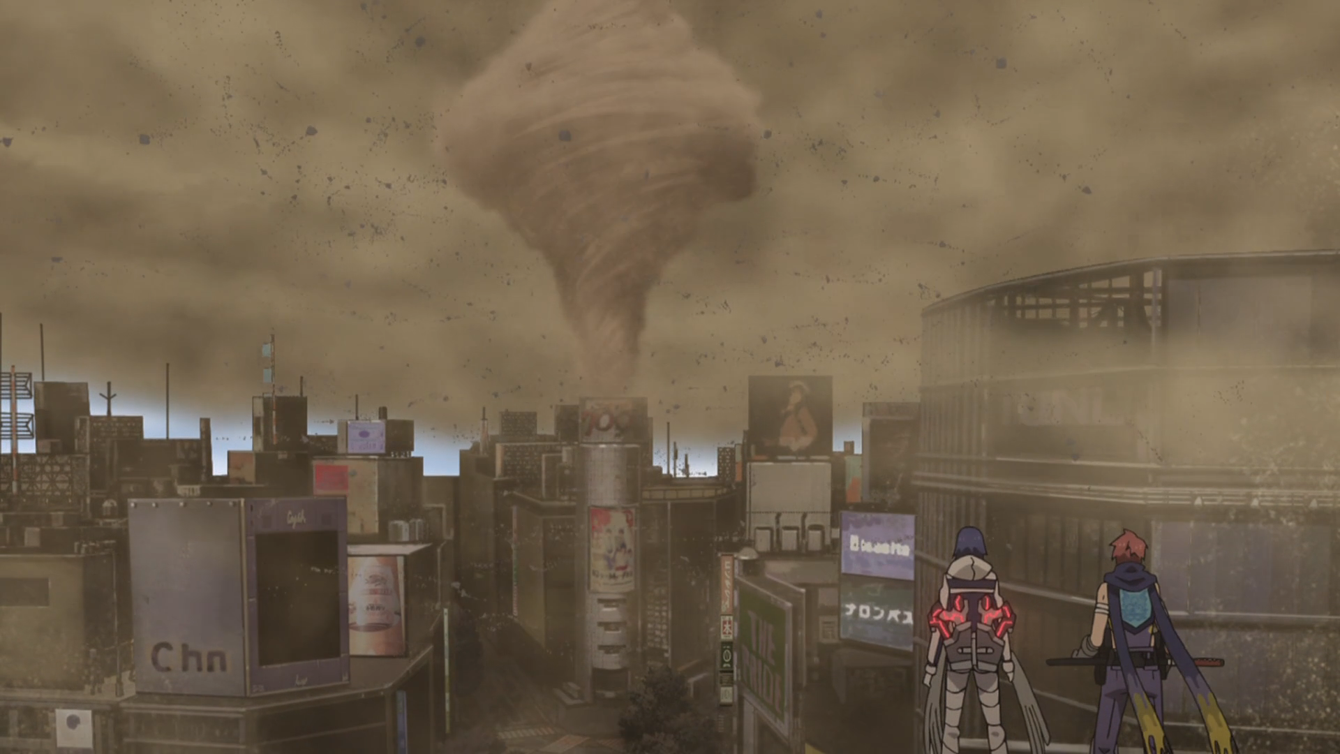 Much of the art within Gunslinger Stratos is one of three flavors: the city, the home base, and the open plains. The former is used the most, with appropriate skyscrapers, streets, and side alleys for a battleground designed for jumping, running, and flying. The latter is the home of the non-main-cast world, but it is only visited during a single episode and is therefore not prominent. When the characters are neither fighting nor traveling, they can usually be found in the second on the list at their headquarters, a smorgasbord of metal and hallways. Collectively, it is often boring to see, with little attention given to lighting or detail, leaving it in a destitute state.