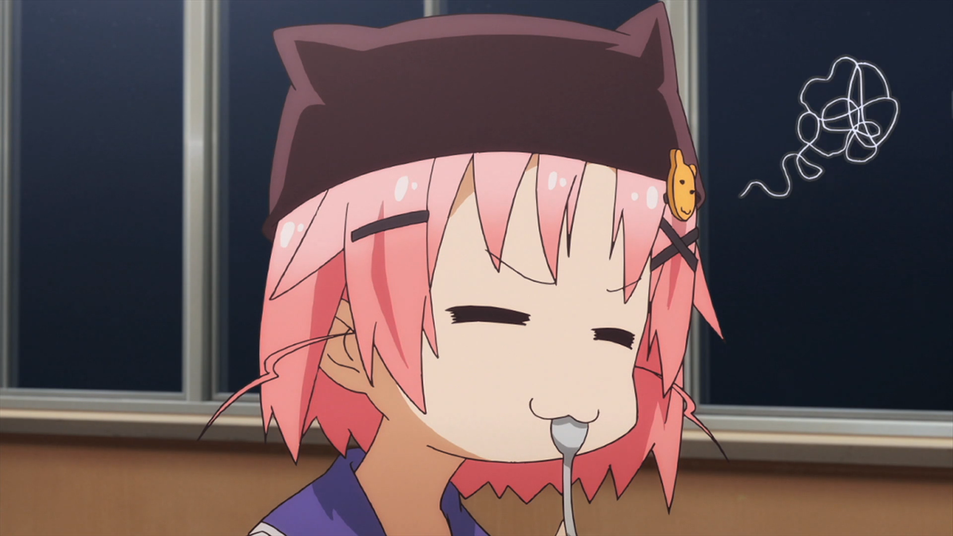 Yuki’s behavior is intriguing because of how she and the others view it. Whether or not she is fully aware of her personality disorder is difficult to pinpoint; clearly she knew that what she was doing was wrong for her psyche – she says as much on the final rooftop scene – but throughout the season she seems blissfully unaware of the troubles surrounding them, solving chalkboard problems in a disheveled room. Kurumi, Yuuri, and Miki understand Yuki’s strangeness, but rather than forcing her to realize the truth they leverage her positivity. The other girls abuse Yuki’s ability to always keep things fresh and fun in order to keep themselves sane. In way, the three of them using Yuki as a motivational booster is demented and likewise insane. To an extent, she is nothing more than a tool, a convenient entity to get them through the day. It is messed up because they know they can help her but they do not. Luckily, Yuki is forced to come to terms with the real reality, saving the others and consequently growing up. To confirm this notion, she lays her symbolically psychological hat to rest, signifying that she has, in fact, graduated.