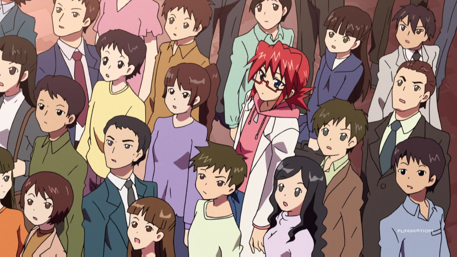 Equally awful are the character designs which are, mildly put, disgusting. Each person seems as if they forgot to use conditioner when taking a shower, their wiry and wonky hair nauseating the audience. Once again, everyone has an overt brightness to their design. Not that light strikes them in a godlike manner, but instead the colors that make up their clothes and hair is unnecessarily saturated. Many of the characters also have abnormally large foreheads. The ones that do not are usually the ones that wear their wiry, unconditioned hair down to cover their defect. Looking in-depth at their actual construction, Junichiro’s lab coat and glasses paint him as both a smart guy and a teacher, his red hair matching his random yet wholehearted passion. Nanami’s spiky hair and slanting eyes turn him into the rough dude he tends to be. Sachiko’s long blonde hair and more formal attire makes her more mature than the rest of the characters despite her small stature. This same inspection can be applied to the entire cast, but given their inherent unsavoriness, doing so too many times would adversely affect one’s health.