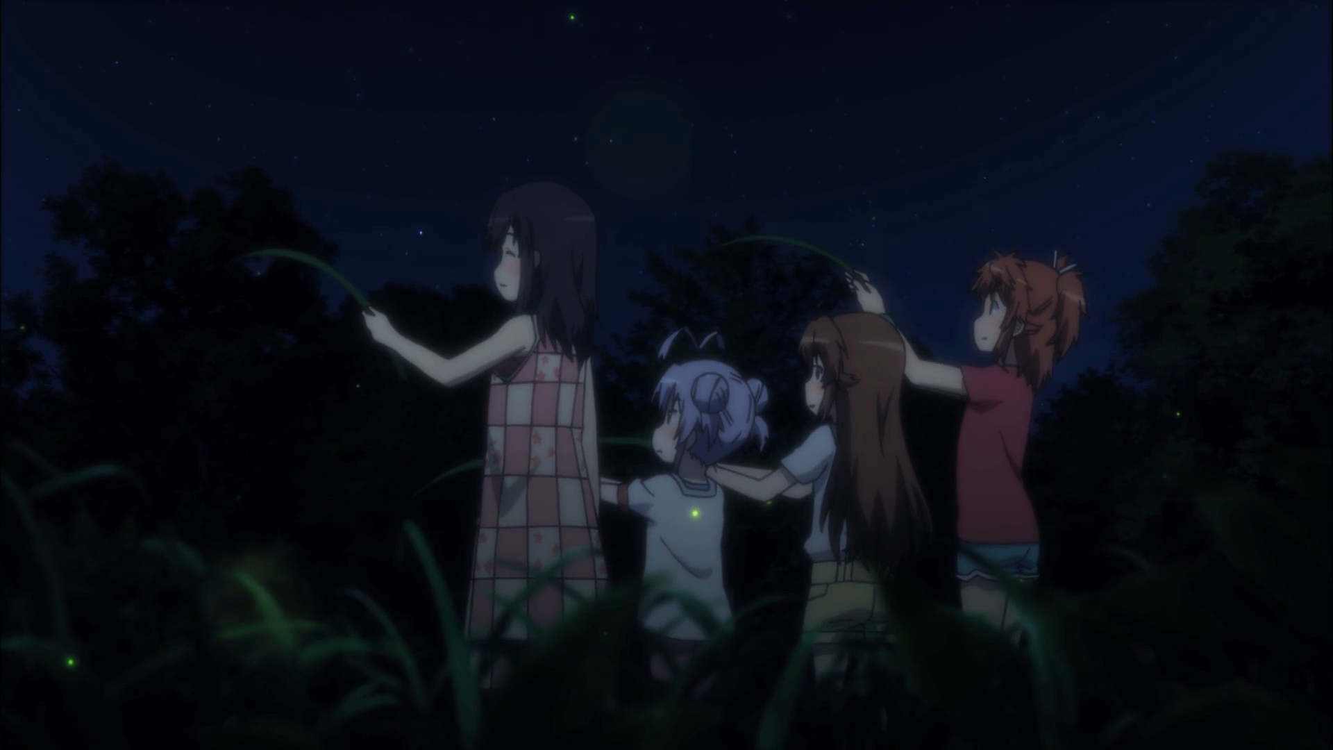 Episode six is entitled “We Made Friends with Fireflies,” and that is the subject of this example. The group comes together during the day to work on homework over their break from school. While working, Hotaru suggests that they come over to her house at night to light some fireworks her parents will be purchasing. The country bumpkins are extremely excited for something they rarely get to see, Hotaru is happy they are coming over, and the plan is set.