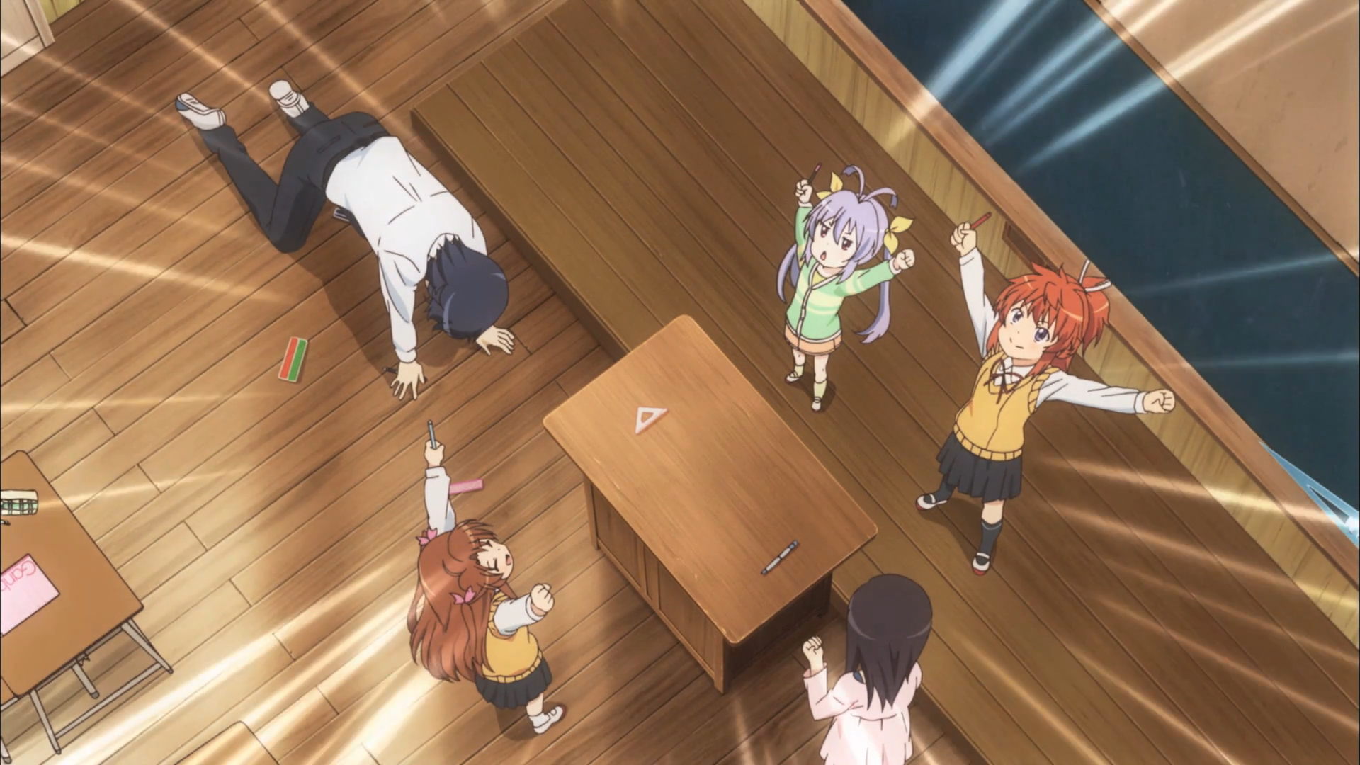 The first scene using the smaller scope happens rather early in the season. Hotaru, Natsumi, and Komari, as well as Renge and Suguru, are in school. After being granted a break by their teacher, the five of them choose to have some fun by playing a game. The game they choose to play is called “knock-down-the-ruler.”