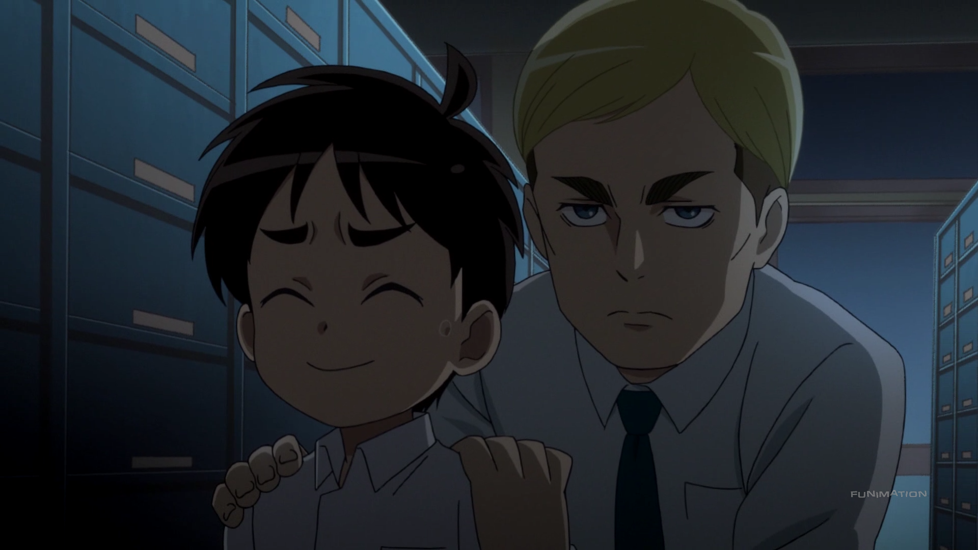 Beyond the parody, the anime also includes other comedic bits. Background dialogue between Ymir and Krista about Eren incorrectly putting his name on a makeshift stamp. The characters nicely timing a repeat joke about Annie going to a Titan-and-human-mixed cram school. Mikasa unfazed by nearly every ridiculous event that happens around her.