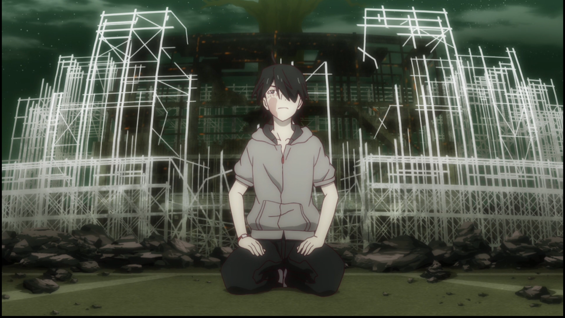 To the left and right of Araragi, the skeleton of the school can be seen. His left and right sides also have a bunch of rubble from the recent explosion. Down the middle, Araragi sits in seiza (the Japanese word for formal sitting) with a massive tree erected directly behind him.