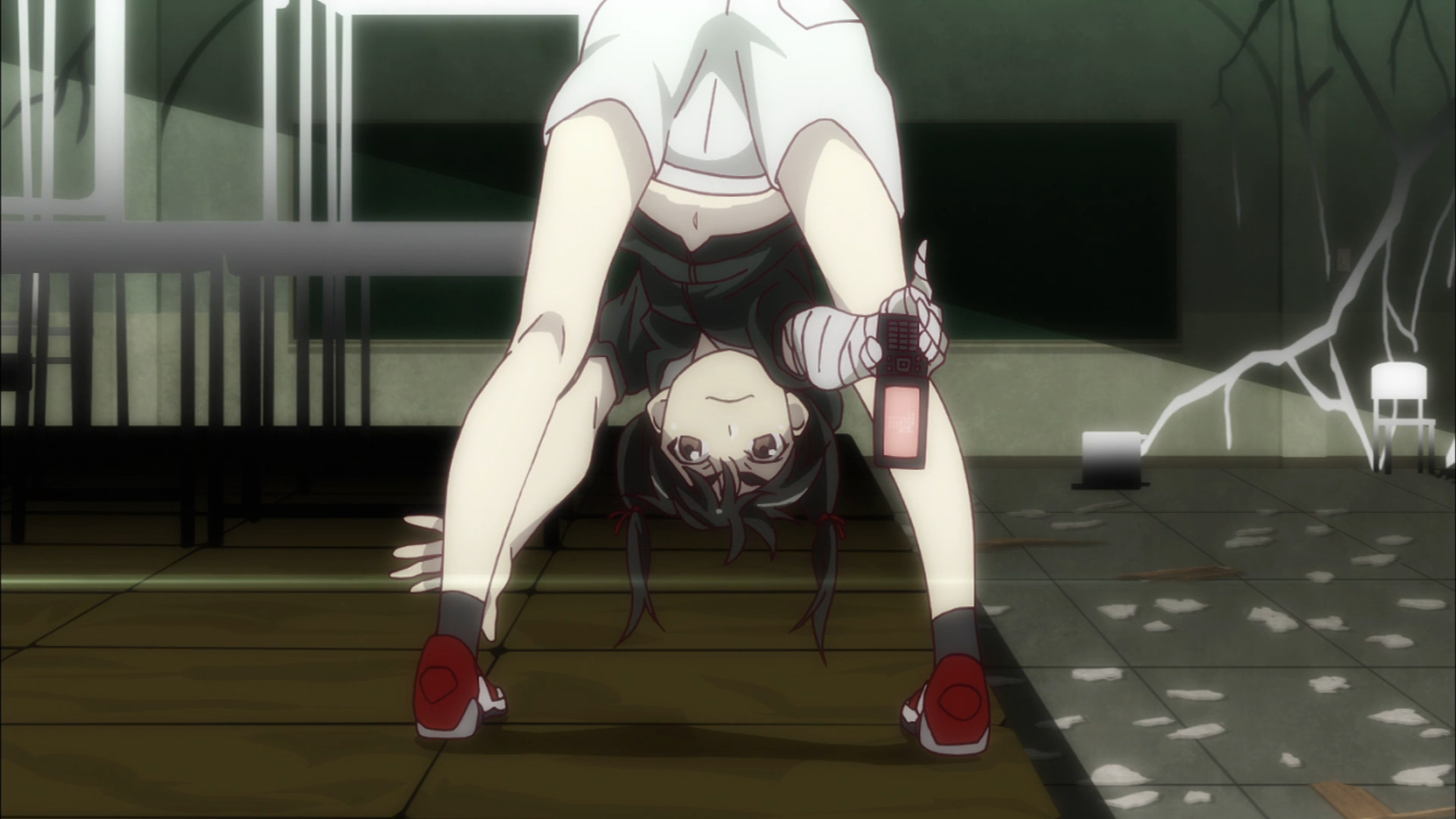 It’s interesting to watch how much asymmetry she creates, especially when contrasted with Araragi. She stands high above him on the desks when talking. She somehow creates makeshift light while he looks on disapprovingly. And she goes through a couple of imaginative scenes as he tries to keep the situation grounded.