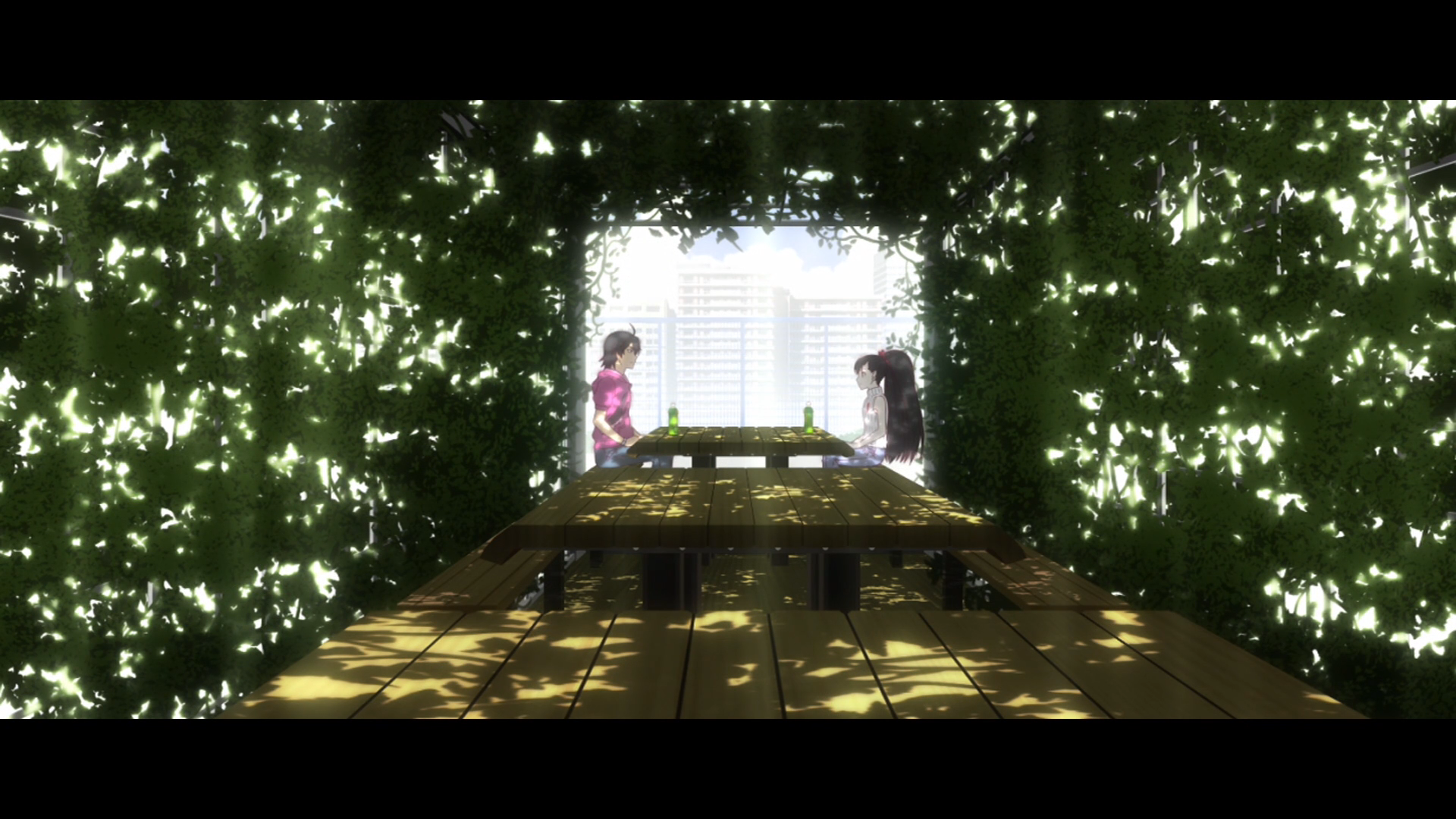 Symmetry first. They sit on opposite sides of the same table, facing one another. They both have the same colored drink. They are framed by a sunlit square. The shrubbery that encases them on the left, right, and top sides has patches where more sunlight creeps in. They are both Shinobu’s minions.