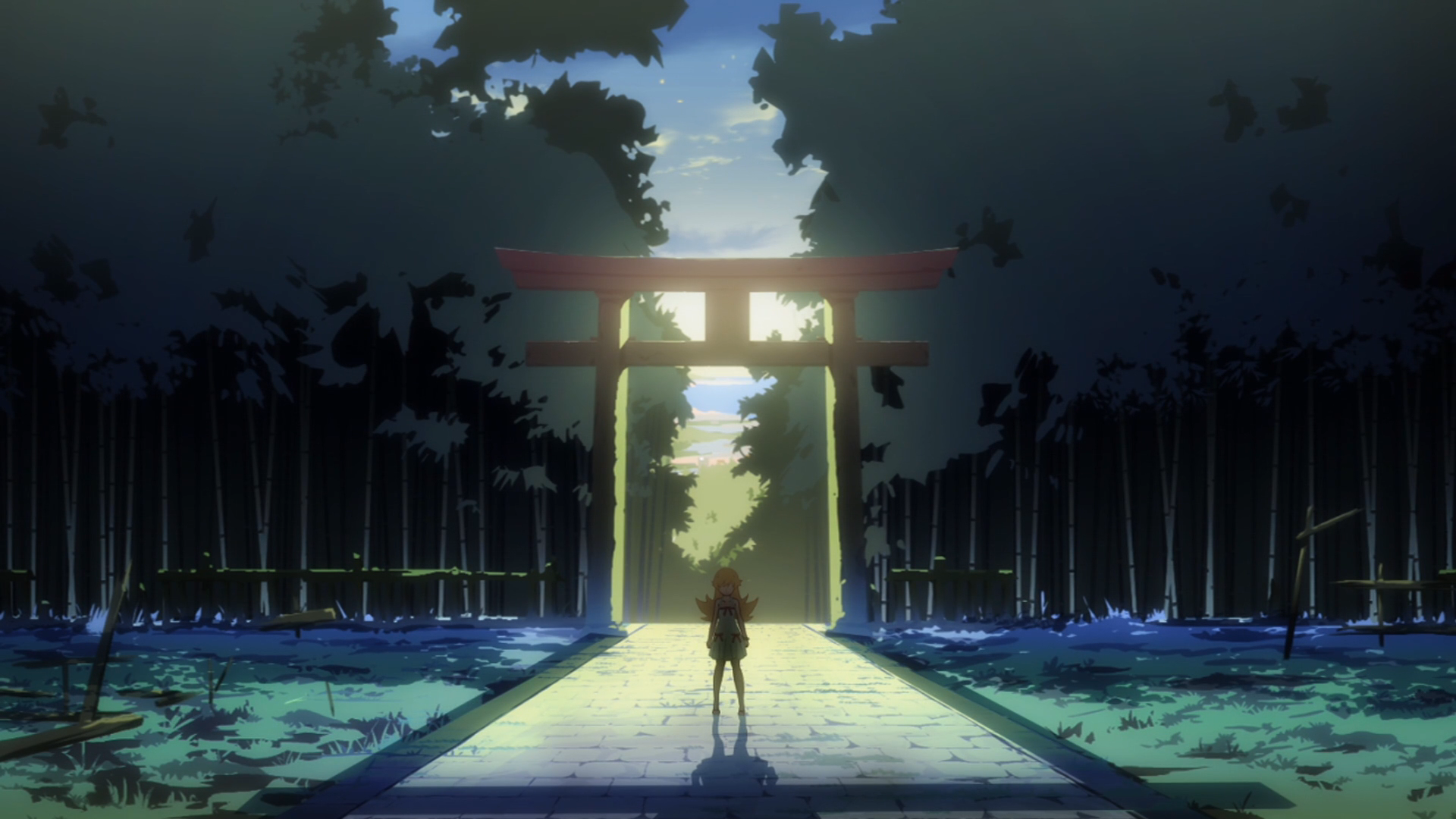 The above shot depicts this beautifully with the use of beautiful symmetry. The left and right sides contain fields of bamboo and a smattering of broken building. In the center, a tall structure composed of multiple rectangles frames Shinobu. As for Shinobu herself, behind her shines light through the structure, veiling her front in sinister shadow.