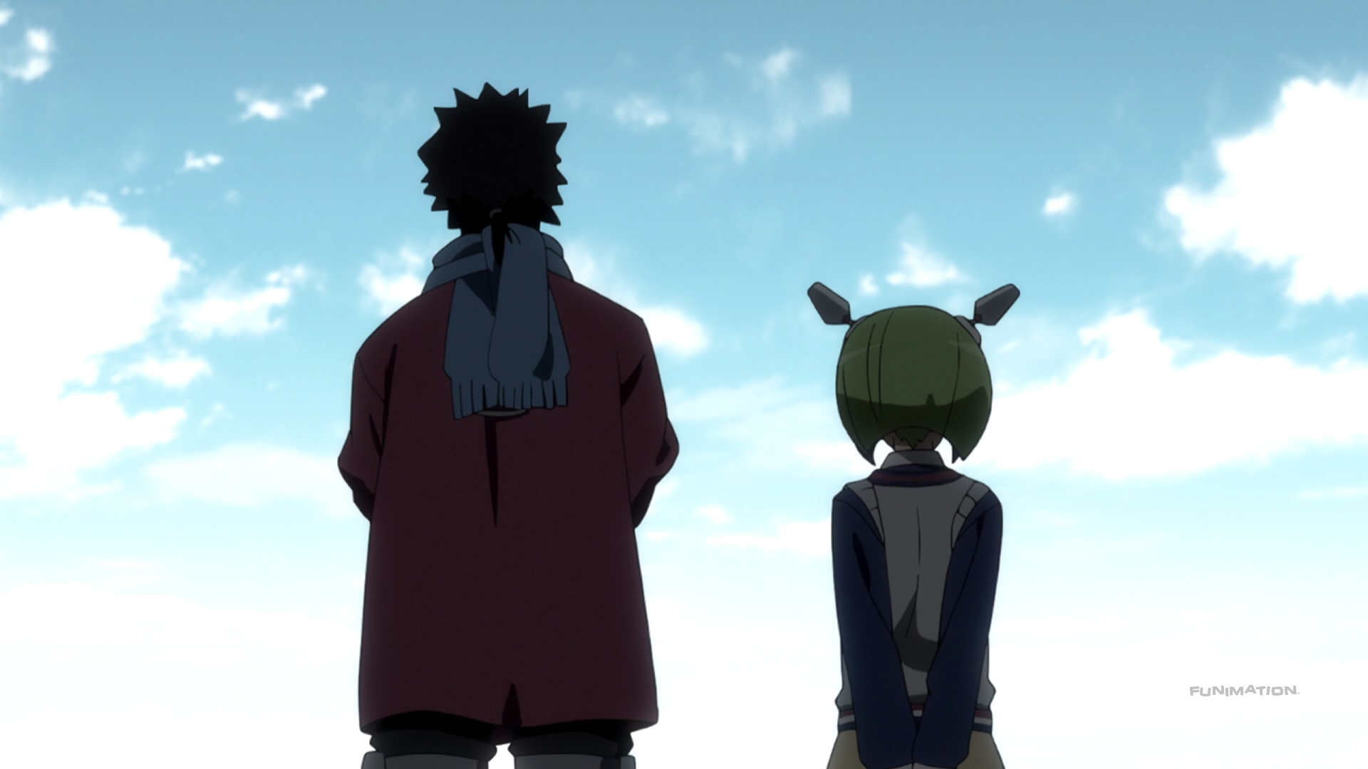 Their relationship is weird, too. Mostly because the transition from Kyouma ragging on the young girl to tolerating her presence has little to do with each other. Yes, Kyouma saves Mira from certain death (twice), but his behavior towards her does not change as a result of their interactions together. Rather, the change occurs because of Kyouma learning more about himself.