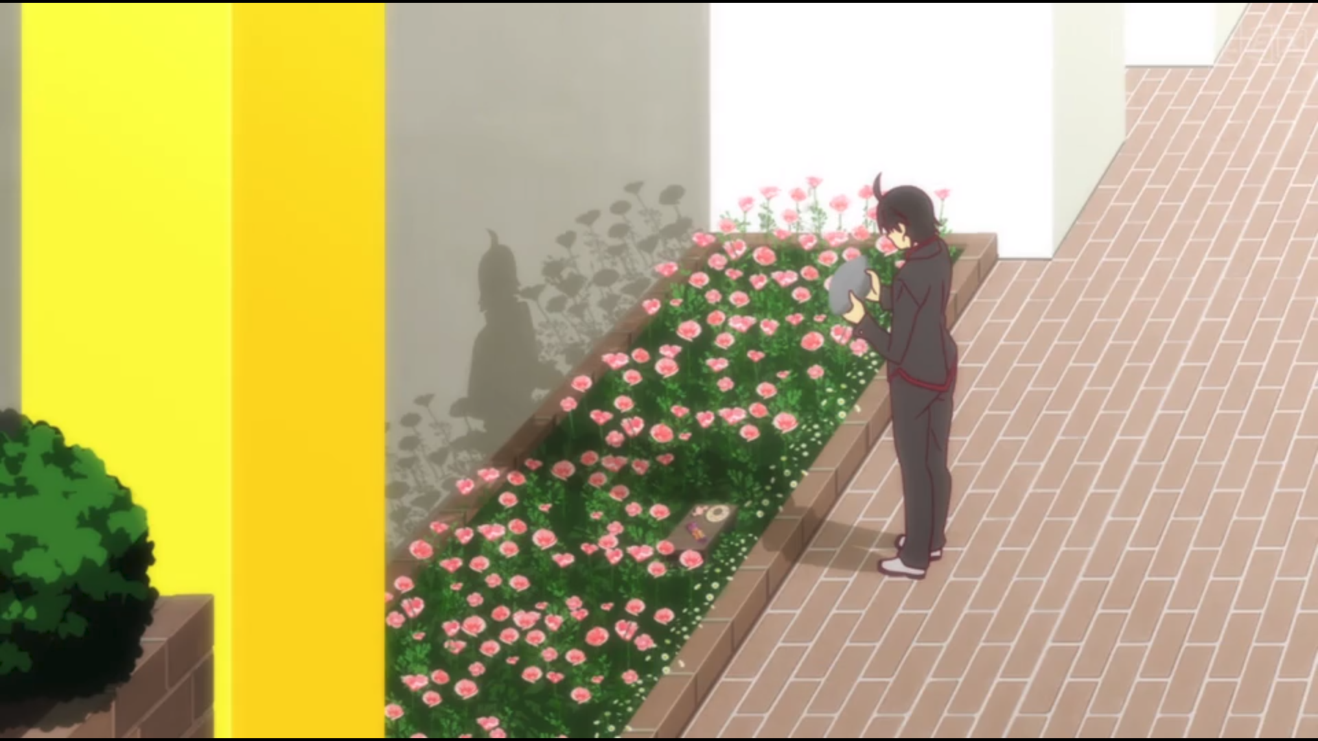 Koyomimonogatari / Episode 1 / Araragi looking at the "stone" block before him