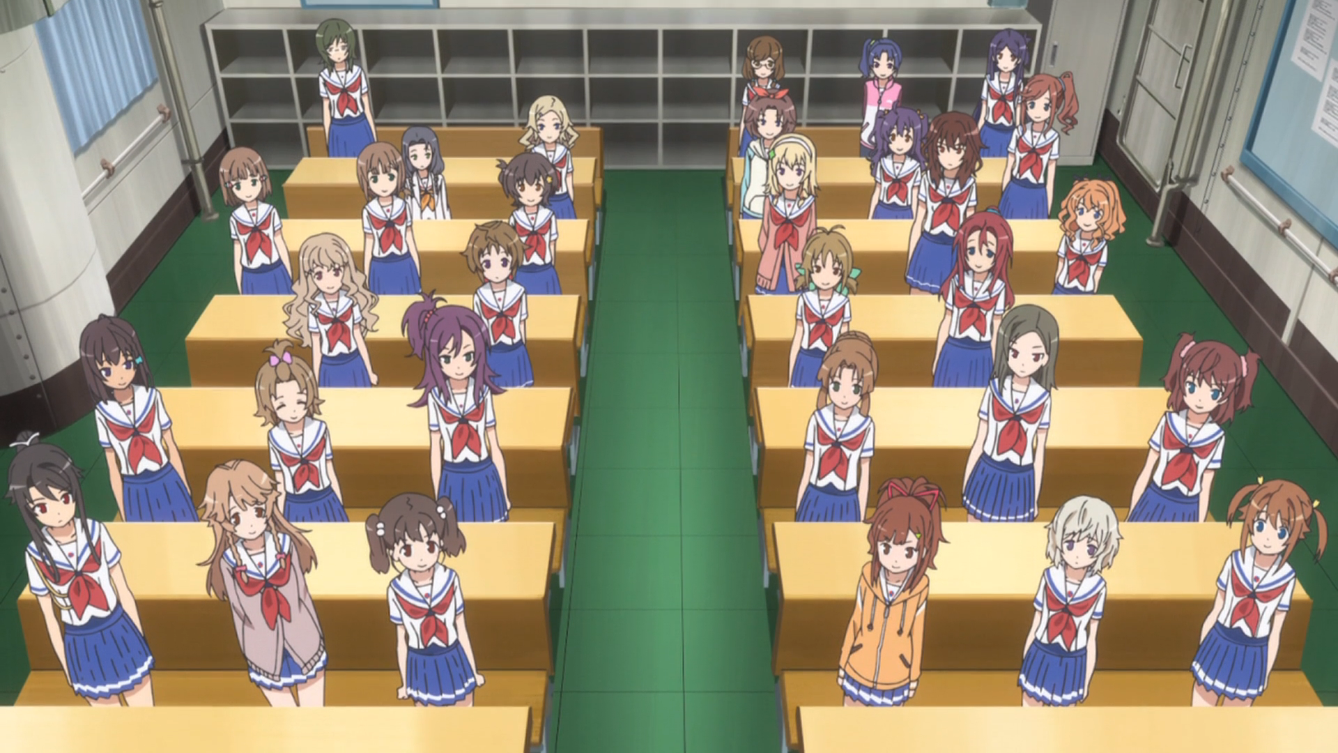 Almost all the girls wear the same set of clothes: a blue skirt, a white shirt, and a red bow-scarf. And they each have detailed eyes to boot. It also helps that the anime will regularly give them different expressions or comedic reactions, helping the show’s slice-of-life side.