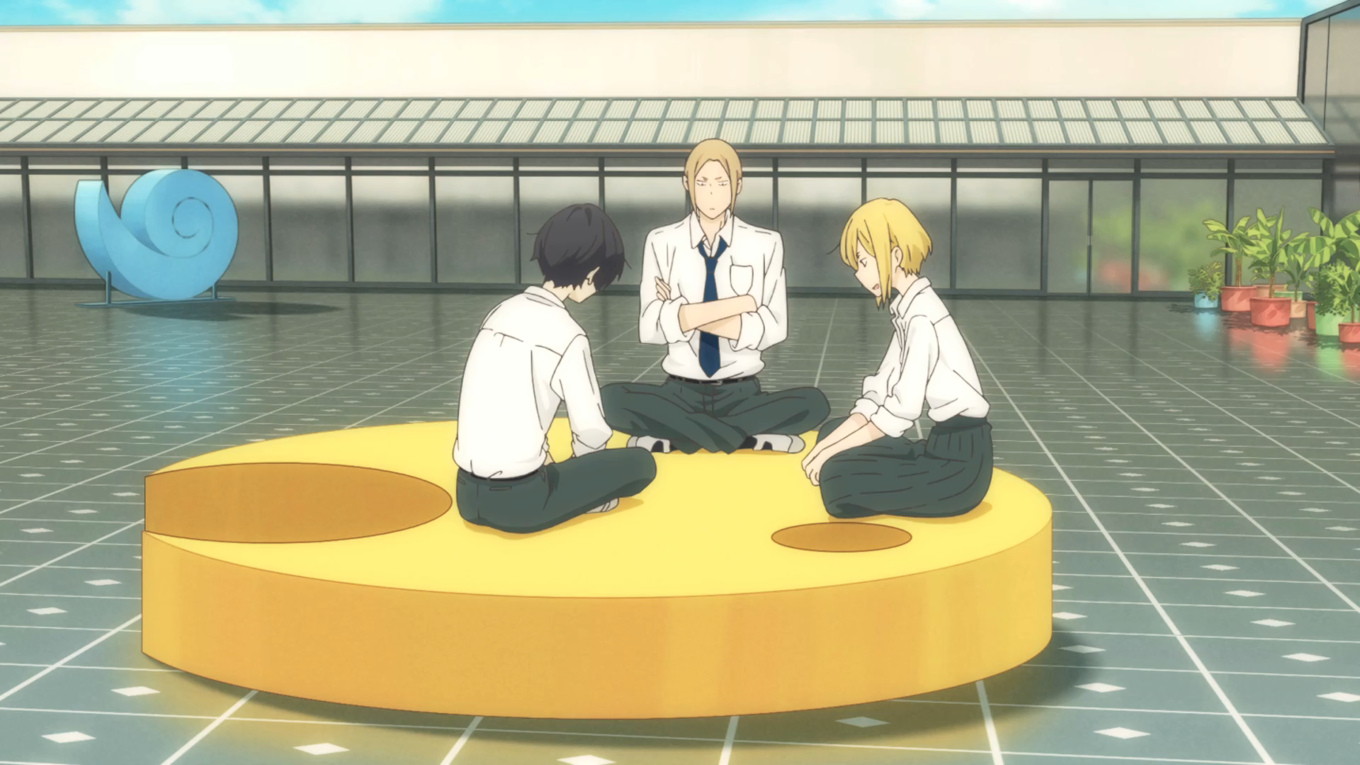 A great example is in episode three. Myaano and Echizen just had a fight. Tanaka walks by while Echizen is still posed, reaching her hand out. Tanaka stops and looks at Echizen, but he doesn’t just do so quickly. Instead, he stares for about five seconds before continuing on (and consequently getting reeled in by Echizen).