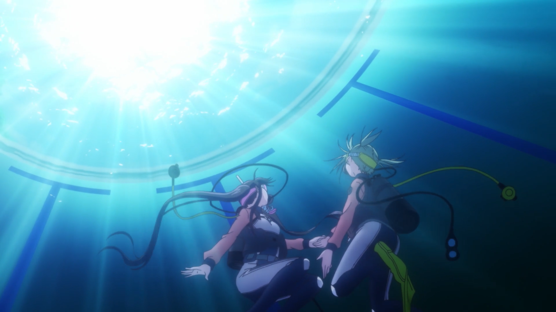 Come time for their first official ocean dive, Teko is the most excited. Her buddy check with Pikari goes swimmingly, but, as they prepare at the buoy to dive, Teko sees the fading light and the swathing darkness that engulfs it. She’s scared, but, when she sees the columns of bubbles from the other divers right below her (after losing her left fin), she becomes reinvigorated, wanting nothing more than to see the new world directly below her.