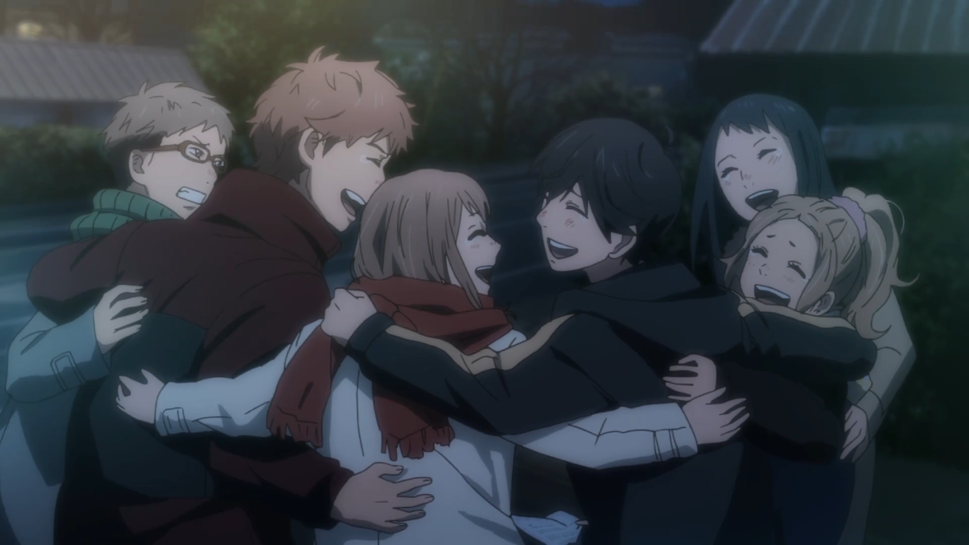 Thankfully, Naho, Suwa, Azu, Hagita, and Takako are there for him. They encourage him during the school competition, each friend carrying one part of the mat as they listen to what he wants to say. They each ask about and get him a present for his birthday. And they each run out late on the fateful night to search for him before he does something that he and the others will regret forever.