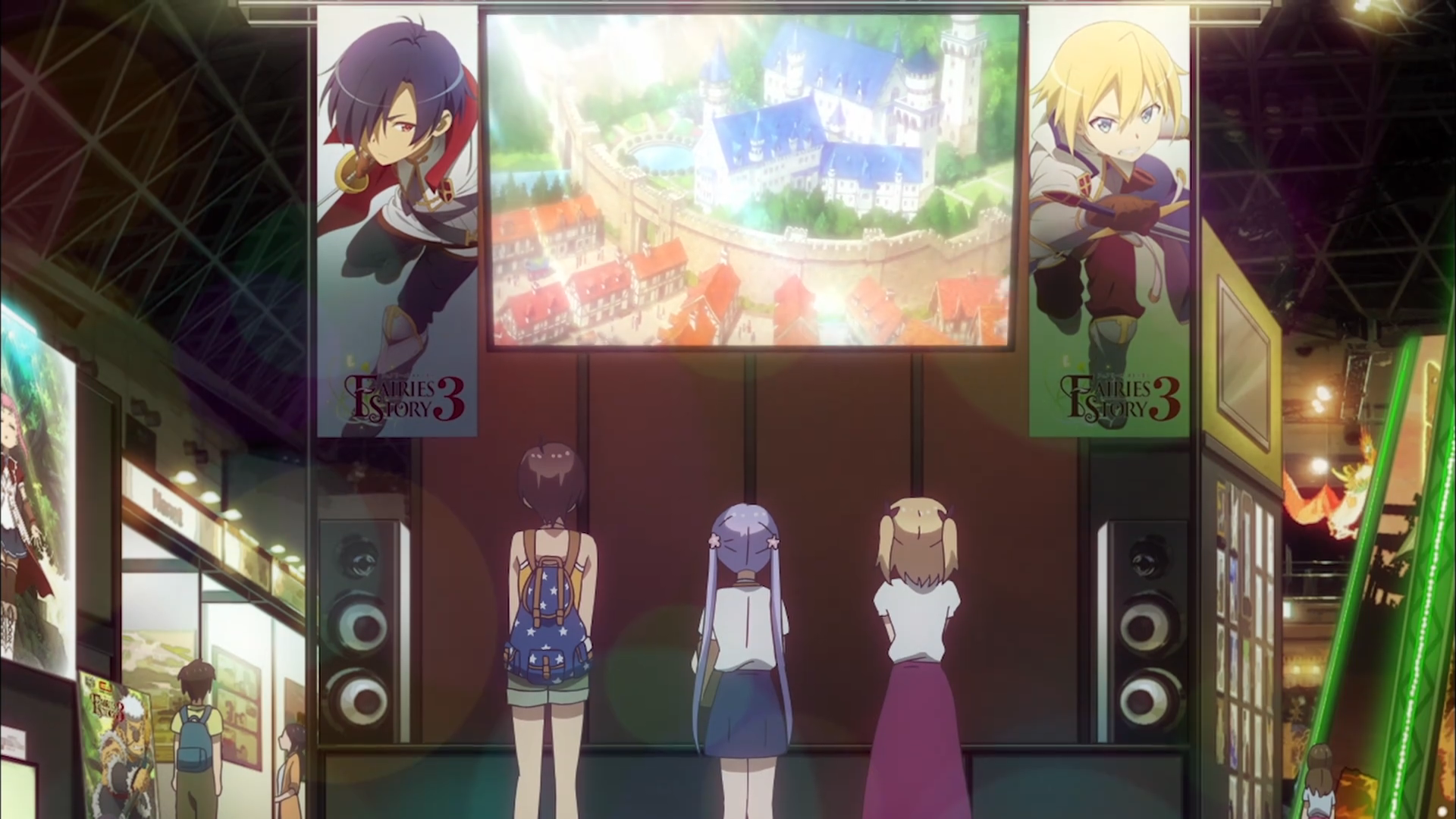 Detailed background art also adds to the anime’s visual appeal. Locations like the inner city, the inside of a movie theater, and a gaming convention show off the anime’s realism. And the desks of the cast – Rin’s refined and proper organization, Yun’s more gothic figures – highlight their personality with just a glance.