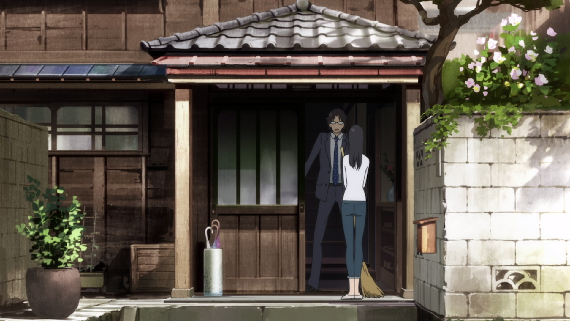Technically the second scene of the series, Fune wo Amu starts its tale with exposition. Araki and Matsumoto-sensei, the middle-aged editor and the elder supervisor respectively, sit down at a restaurant and talk with each other. While rather on the nose, it gets the job done. From their dialogue, the audience knows the overall problem (creating a dictionary) and what the immediate goal is (finding a successor). In these couple of minutes, the anime creates the foundation for its plot, giving it a clear heading from the get-go.
