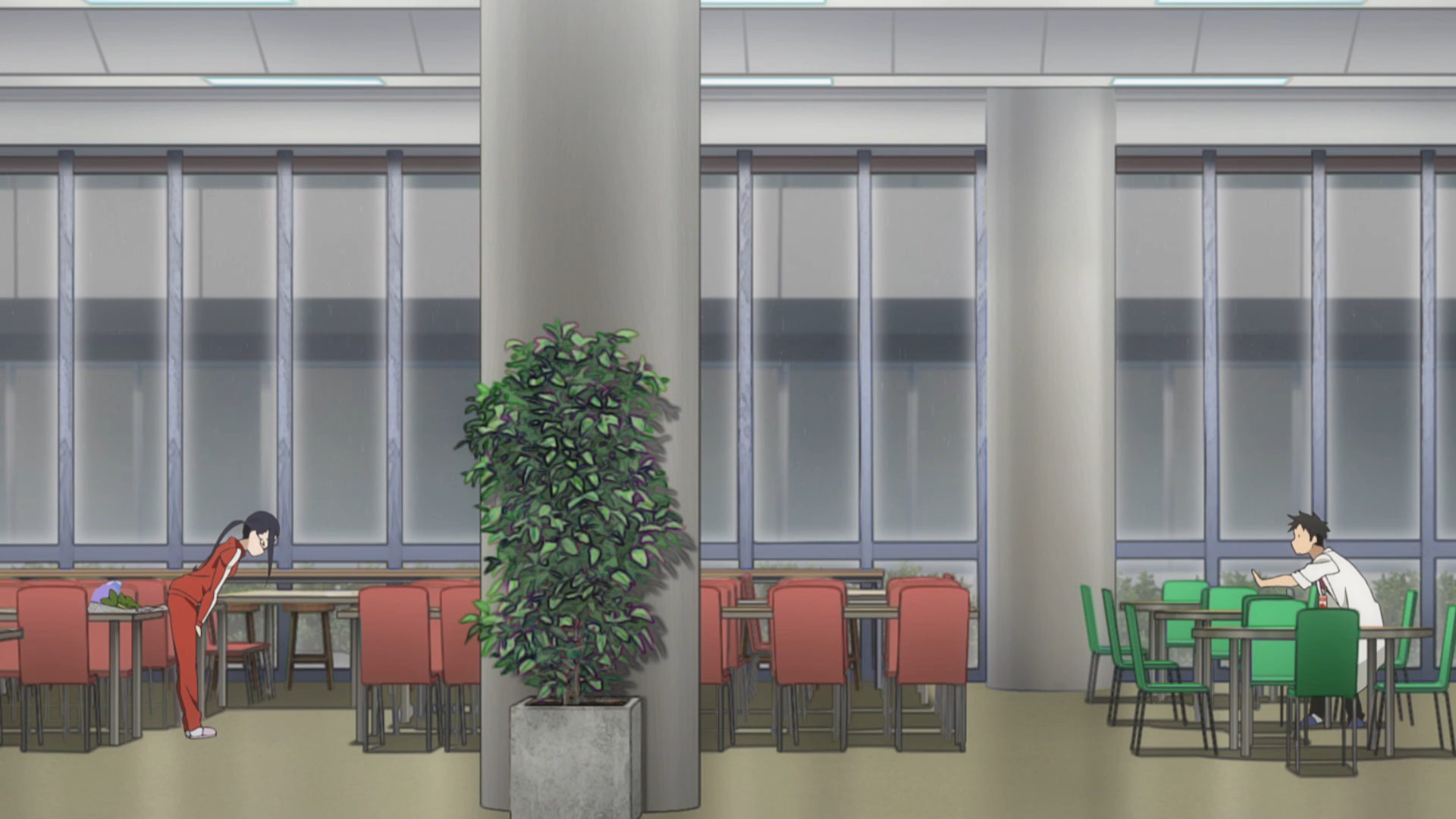 For example, in episode four, Satou-sensei runs into Takahashi-sensei in the cafeteria. As they talk, she apologizes for her assumptions about him after she realizes how hard he has been trying to understand the demi girls. Through dialogue, she insists on helping Takahashi-sensei. Visually, the foreground concrete pillar separates them both while her side contains red chairs and he sits among green ones. So, when she crosses over to his side of the screen, she both breaks the barrier between them and starts their newfound relationship.
