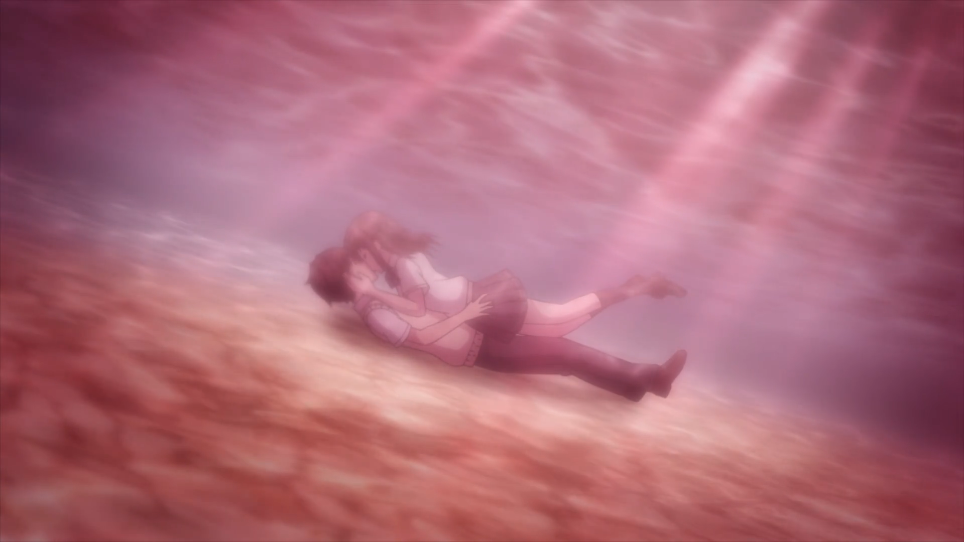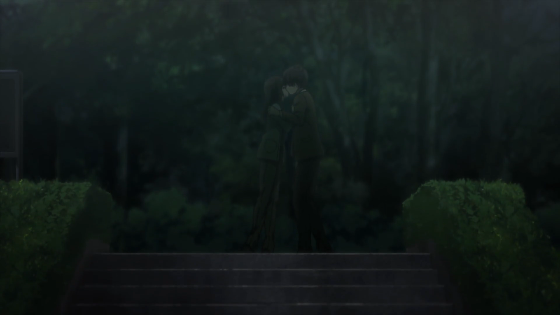 Still, at the Founder’s Day festival, Kyouko hesitates in front of Shouichi’s persistence to speak with her in private. Yet she knows that there’s something that makes her happier now. Her friends give her a final push (and some oden), and, once on the rooftop, she shows how much she has grown up. She sits between his legs, “confesses” her feelings, and faces him in earnest. The two cap off her arc with a romantic kiss, fireworks exploding in the background.