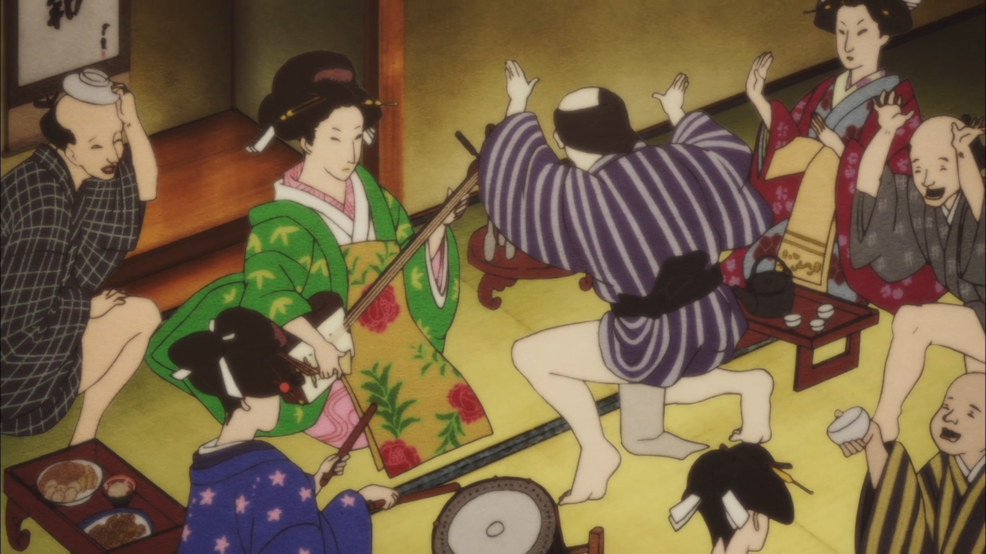 Nearly (if not every) episode has at least one downright major moment that grips the audience with its care and its purpose. In episode three, Yotaro berates the gangster boss as a declaration of his love for Konatsu and Shin. In episode five, Bon collapses on stage after witnessing Miyokichi in the surrounding smoke during his performance of “Hangon-ko” which in turn leads to Sukeroku finally (and briefly) speaking to him for the first time in his fever dream.