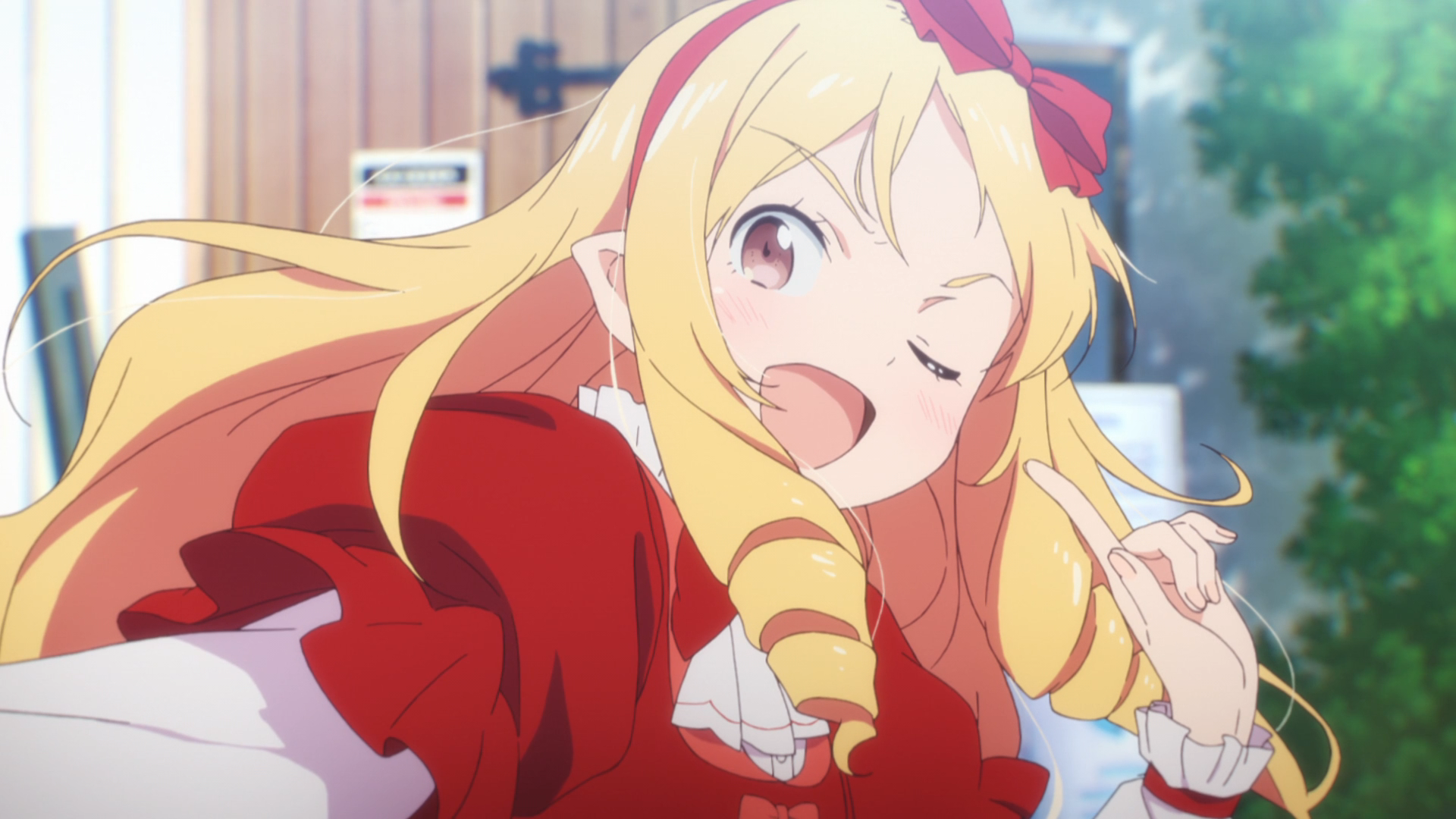 It dries off with more funnies, too. Its ecchi jokes about penises. The running gag with Sagiri’s door always swinging open and smashing Masamune’s face. The show “rewinding the tape” as Elf double checks that he is really her next-door neighbor. None of these scenes are downright hilarious or extremely clever, but, all told, Eromanga-sensei finally has a net positive on its hands with the comedy it touts.