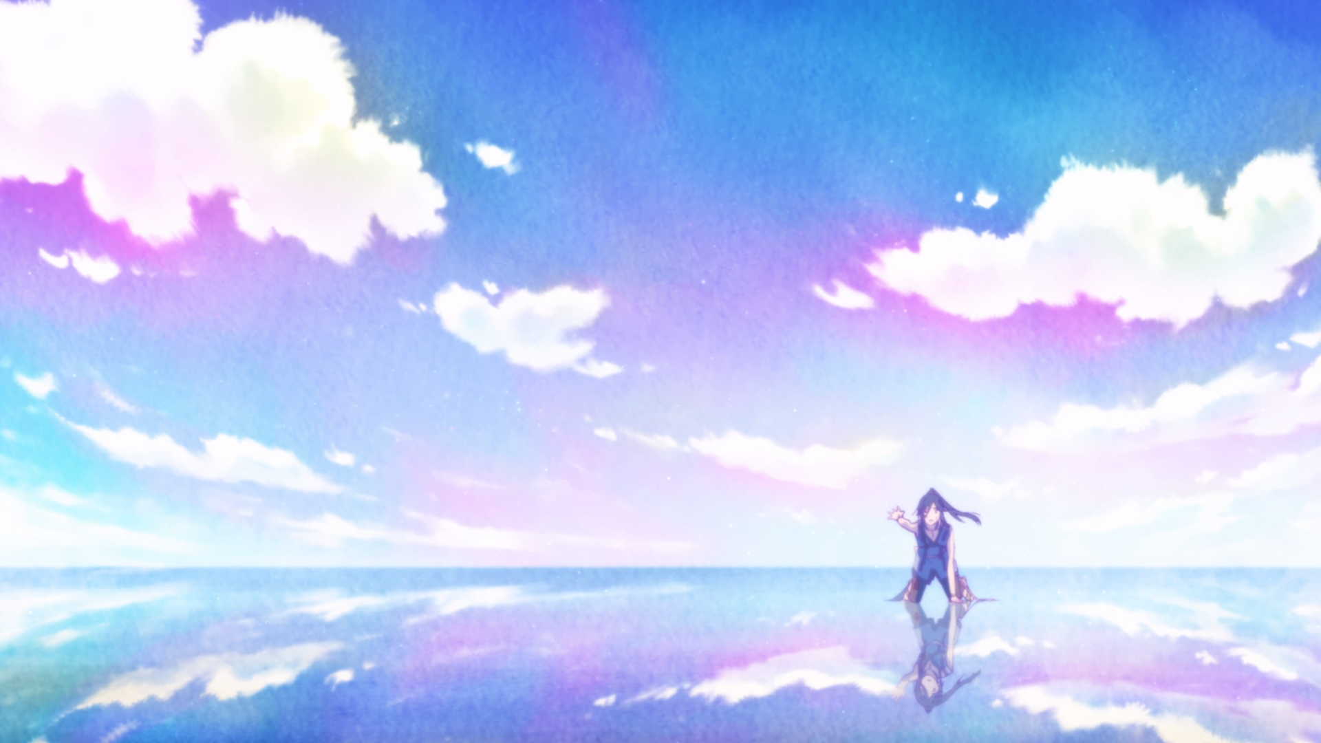 Chief among its wonders is the color palate. The anime opts for a watery fade to achieve its softer hues, coinciding with the sea motif and forming the watercolor looks for many of its visuals. It also chooses much lighter colors in general: pinks, teals, yellows. They add a vibrant contrast not only to the darker blues and purples but also to the overall darkness of the mood at hand.